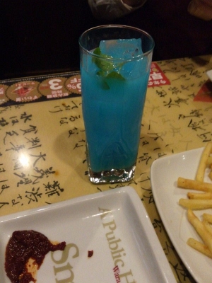 やたらと青いお酒…みんなで写真を撮って、同時にツイッターにあげたり実況しながら食べてました(笑)